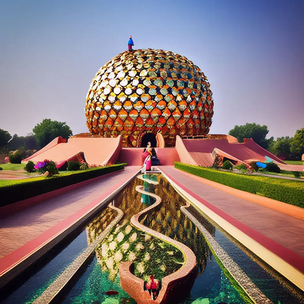 Сердце Ауровиля — Матримандир - золотой купол-сфера, парящий над землёй, словно застывшее солнце. Это не храм какой‑либо религии, а пространство для медитации и внутреннего поиска. В центре зала — хрустальный шар, в который падает луч солнца. Вокруг — сады, водопады и тишина, помогающая услышать собственный голос души.